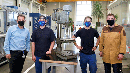 The most recently restored object is a unique bench drill made in 1949. It was built when ERNST GROB MASCHINENFABRIK was still located on Hofmannstrasse in Munich and was delivered on April 12, 1949, for 785 reichsmark. This is interesting, since the Deutsche Mark had already been introduced on June 21, 1948, as part of the currency reform. GROB's Trainee Department noticed this machine thanks to private research by Stefan Nattenmiller, trainer of the Mechatronics Department. It was located in a private workshop in Hallertau, Bavaria. The owner wanted to replace it with a modern drill press.