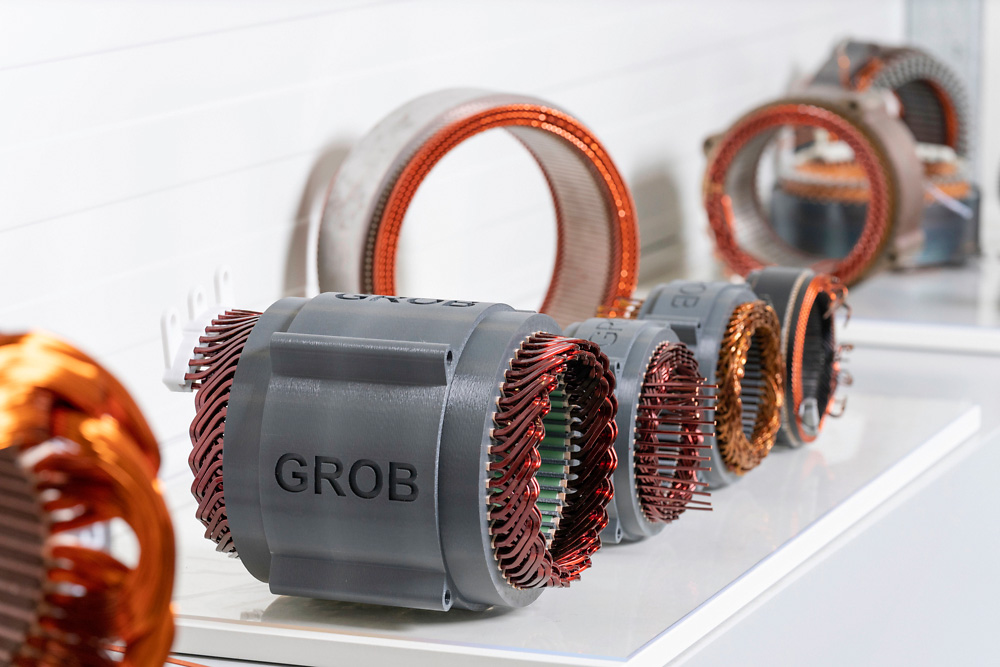 The GROB plants in Mindelheim and Pianezza, Italy, continue to lead the way in electromobility. For example, the winding technology and insertion technology, which are used to draw round wires into the stator via a complex process, are based at GROB Italy, as is rotor production technology. By contrast, GROB Mindelheim develops and produces the stator technologies for rectangular copper wire, also known as hairpin technology and wave winding technology. The technologies of both plants enable GROB to provide all known manufacturing processes for electric drives that are relevant for automotive companies.